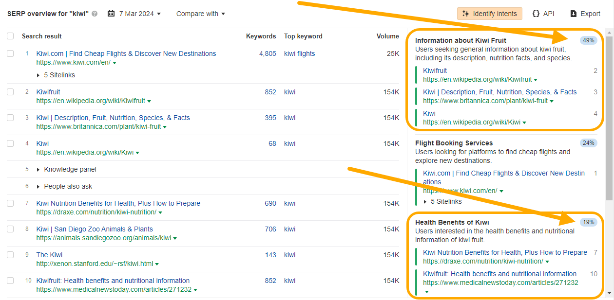 在这里,您可以看到,估计有 49% 的流量流向了奇异果的基本信息。但还有另一个角度值得关注:估计有 19% 的流量特别关注 吃奇异果对_健康的益处_ 。