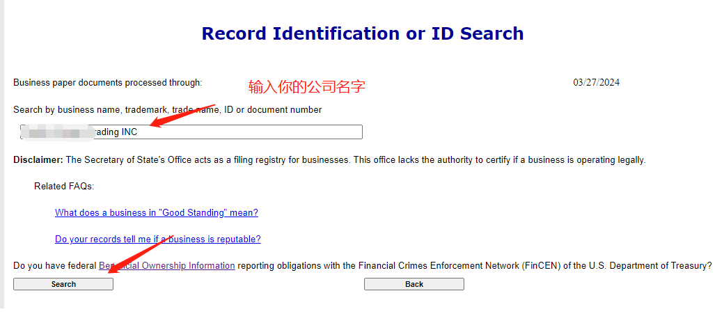 在搜索框中输入你的公司的名字,然后点“search”,如图: