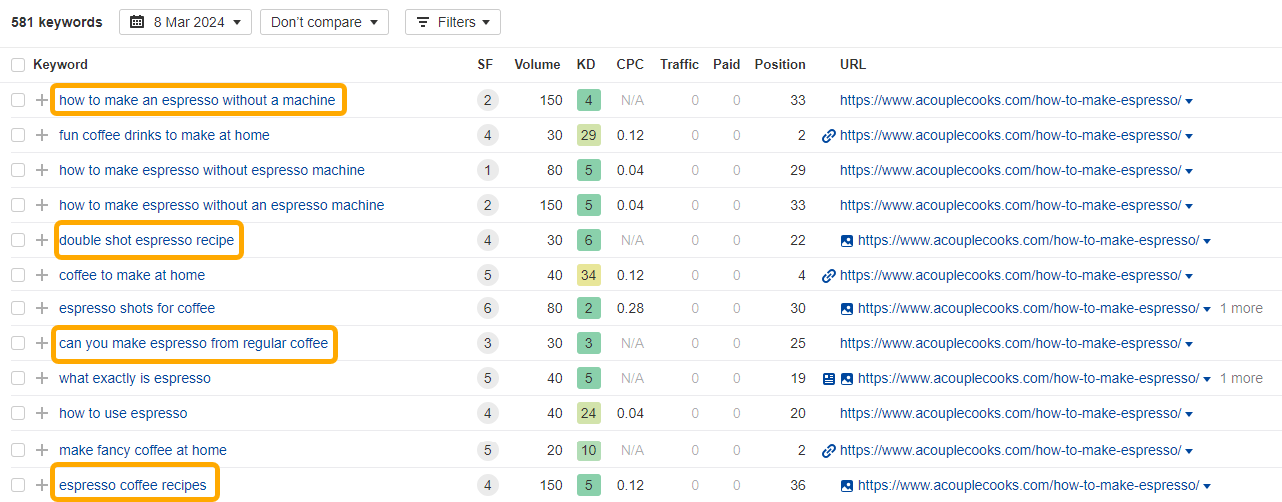 您也可以使用网站浏览器查看每篇文章的不同关键词排名。从这些选择中,也许值得介绍_如何在没有意式咖啡机的情况下制作意式咖啡_: